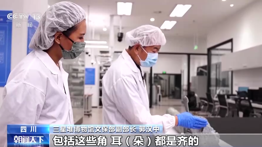 三星堆博物馆文保部副部长 郭汉中:它有很多东西都是用牙璋装饰,包括有些人的衣服有几件都是用牙璋来装饰的,包括这些角、耳朵都是齐的,这些明显是鳞片,明显是虎纹,真正的这件东西实际上是个完整件,应该是固定到什么上面用的,你看它现在固定的这个孔都有。