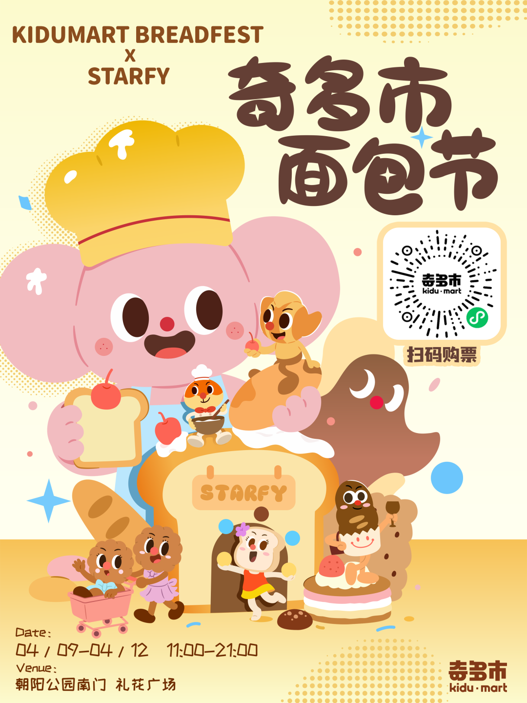 「奇多市面包节」2026春季场即将于4月再次落户北京朝阳公园。本次活动邀请了来自韩国的艺术家Lee Yeonwoo,以其笔下的知名形象Starfy为奇多市面包节绘制了活动主视觉海报,将Sartfy与众多「面包脑袋」们进行了趣味十足的融合,并会在现场带来双方合作的多款展会限定周边。