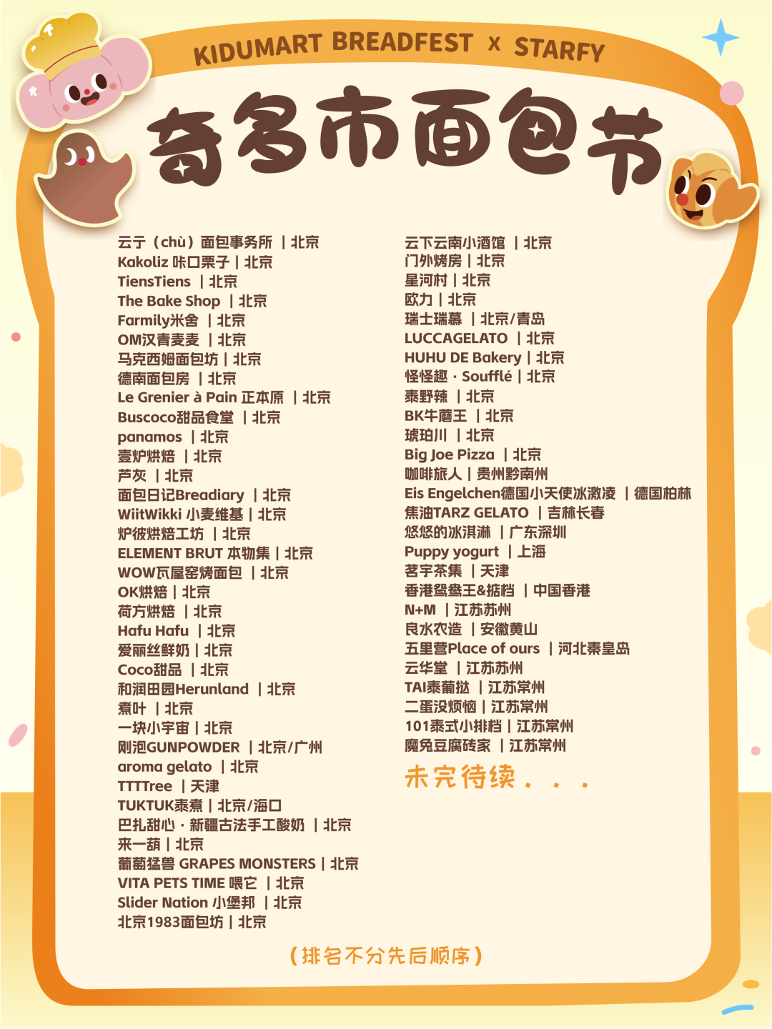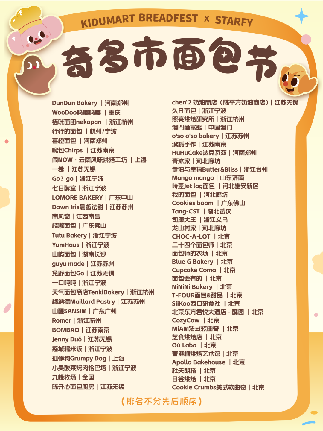 DunDun Bakery、WooDoo呜嘟呜嘟、猫咪面团nekopan、啾包Chirps、七日酵室、一卷、Go?go、LOMORE BAKERY、Dawn Iris晨鸢法甜、南风窗、桔瀧面包、Tutu Bakery、YumHaus、山屿面包、一口吨吨、FarmLetter、天气面包商店TenkiBakery、1997baker、Age.3、梅纳德Maillard Pastry、陈开心面包厨房、BOMBAO、山醒SANSIM、久日面包、Romer、照亮烘焙研究所、澳門酥富匙、o'so o'so bakery、湫栀手作、JOJOPUDDING、LUÔ+ PÂTISSERIE 洛嘉法式烘焙店、Cookies boom、Tang-CST、来吉果手作烘焙店、司康大王、Jenny Duǒ、慈城糯米饭、孤僻狗Grumpy Dog、热叁叁