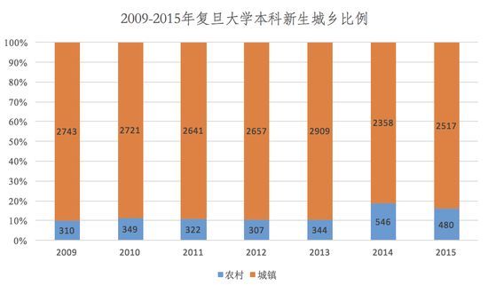 再以复旦大学为例,据2009年至2015年连续7年的统计结果显示,复旦大学来自农村地区的本科新生仅占10%左右,而城镇户口新生的比例则长年高达80-90%。