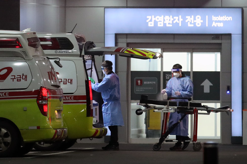 2022年3月22日,在韩国首尔,急救医疗中心医务人员对救护车和担架进行消毒。
