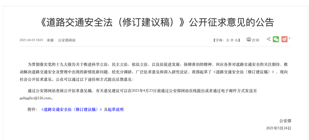《道路交通安全法(修订建议稿)》公开征求意见的公告