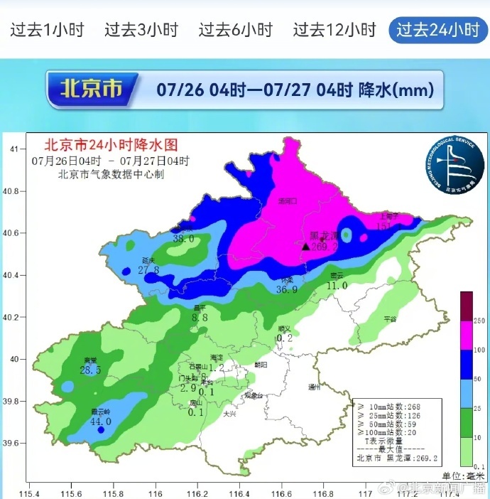 北京市气象台今天凌晨发布的最新数据显示,26日10时至27日1时全市平均降水量17.1毫米。最大降水量出现在密云黄土梁315.3毫米;最大降水强度26日22时-23时出现在怀柔东峪,降水95.3毫米。27日0时-01时最大降水量,出现在密云黄土梁,为46.0毫米。