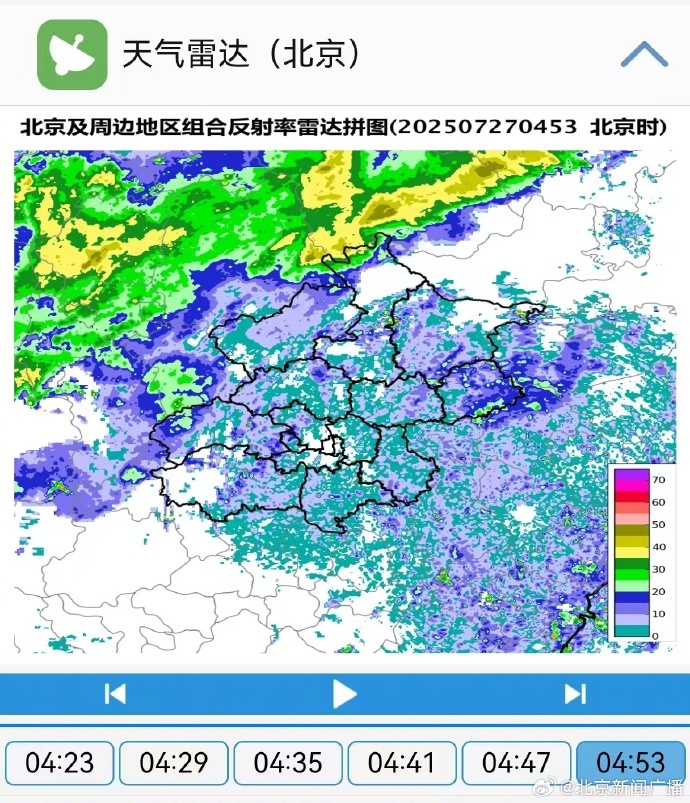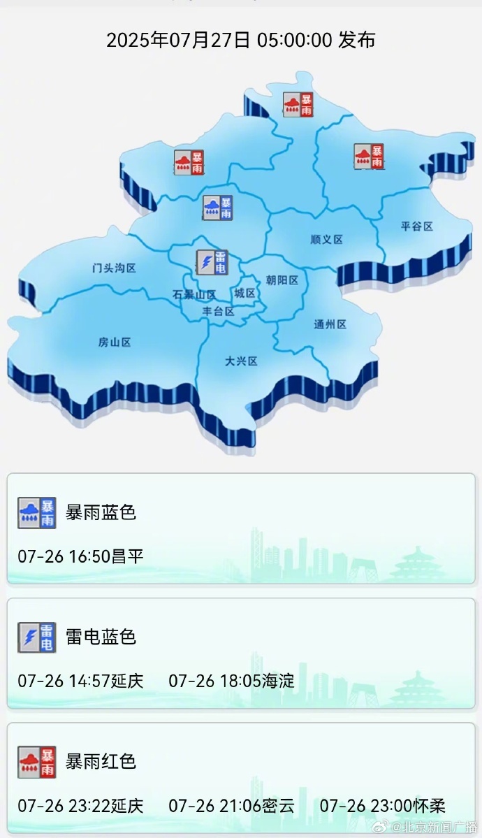 今天凌晨1时,市气象台发布的天气实况及预报显示,本市北部地区降水已减弱,预计未来2小时延庆、怀柔、密云有阵雨,最大小时雨强20-40毫米。