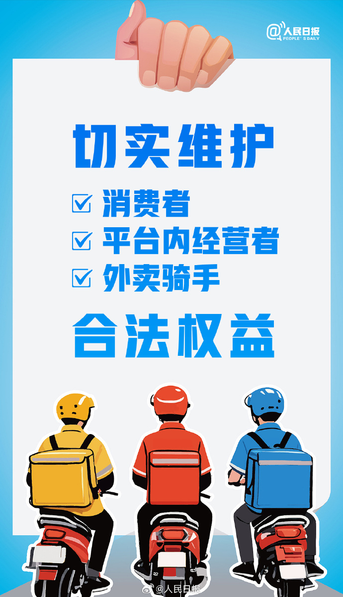 市场监管总局要求,相关平台企业严格遵守《中华人民共和国电子商务法》《中华人民共和国反不正当竞争法》《中华人民共和国食品安全法》等法律法规规定,严格落实主体责任,主动履行社会责任,加强内部管理,合法规范经营,公平有序竞争,共同营造良好市场环境,切实维护消费者、平台内经营者和外卖骑手的合法权益,促进平台经济规范健康有序发展。
