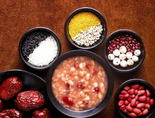 提到腊八节,自然少不了腊八粥。腊八粥,也叫“七宝五味粥"。在民间,每逢腊八这一天,家家户户都要做腊八粥,祭祀祖先。同时,合家团聚在一起食用,馈赠亲朋好友。腊八粥在宋代已经十分流行,它用料讲究,常以糯米、芝麻、意仁、桂圆、红枣百合、莲子等制成,人们赋予食材美好寓意如桂圆代表“团圆”,百合意味着“万事和睦”等。