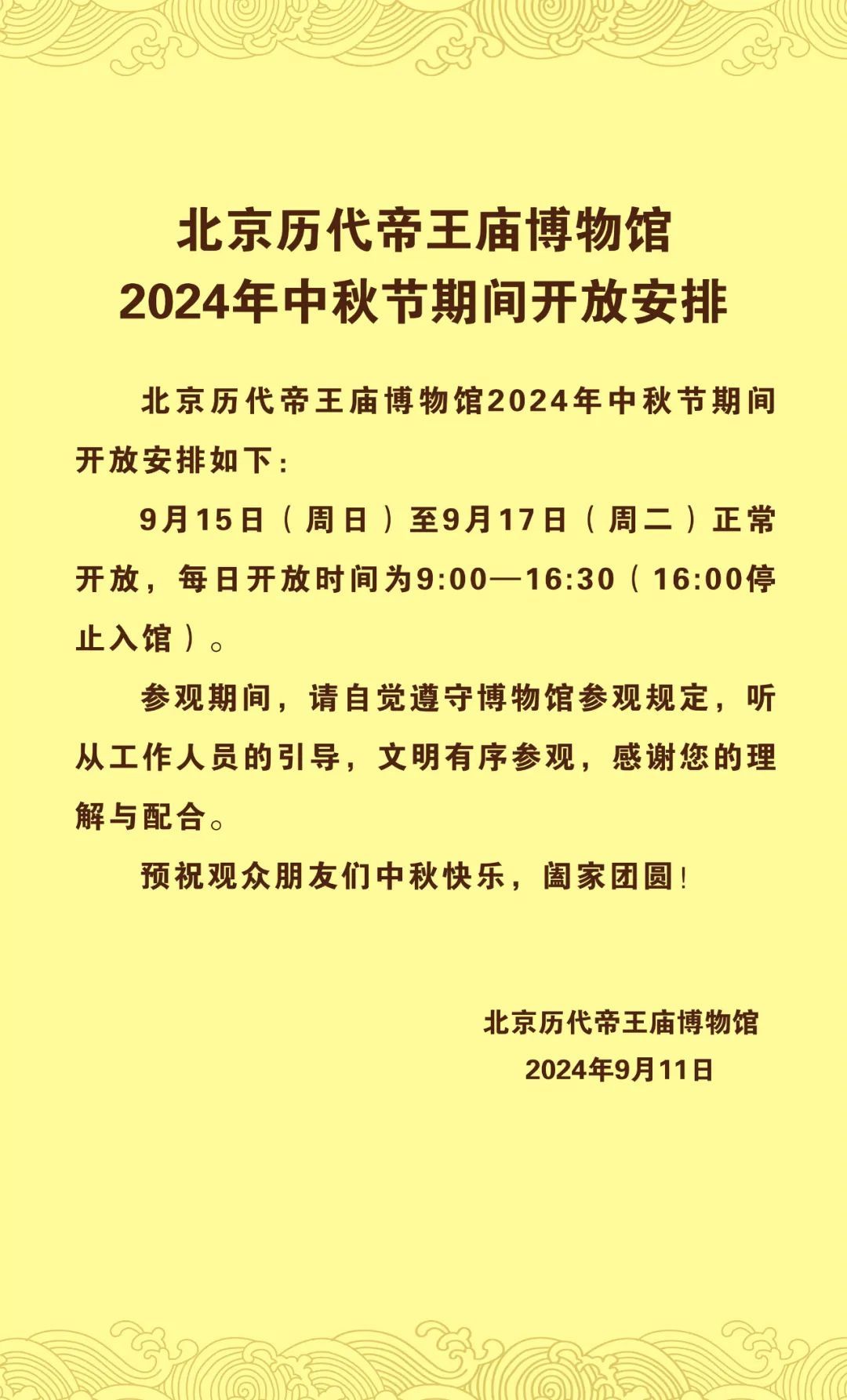 根据北京市政府办公厅关于2024年中秋节放假的通知精神,2024年9月15日-2024年9月17日开馆时间为: