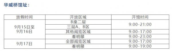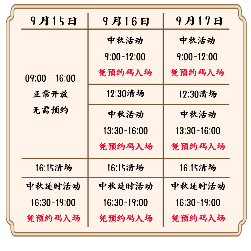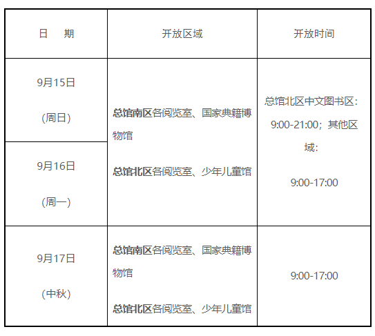 9月15日至9月17日(含周一)正常开放。开馆时间为9:00,停止入馆时间为16:00,闭馆时间为17:00。