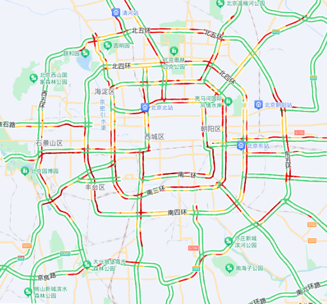 城区北部、东部、西部主要环路部分路段,莲石东路、阜石路、通惠河北路、万泉河路、西直门北大街、菜户营南路等联络线进城方向,京承、京藏、京开、京港澳、首都机场高速、京通快速路等主要高速进城方向局部路段交通压力集中,学校、医院周边道路易出现短时车行缓慢。