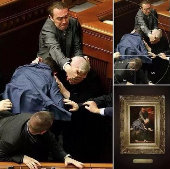 乌克兰议会打架早已不是什么新鲜事了,多年来,大大小小的打架不计其数。大会上打架、小会上也打,有群殴的、也有一对一单挑的。打着打着,倒也留下了不少充满艺术气息的现场照。比如这张"名作",完美地符合黄金分割,被做成了文艺复兴时期的油画: