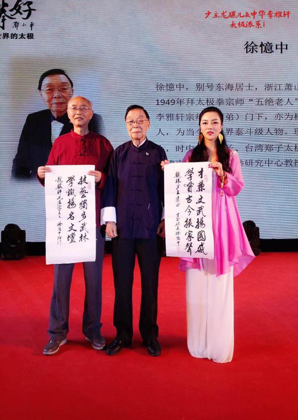 徐忆中不愧是世界太极名家,94岁高龄台上台下健步如飞。除了发表了热情洋溢的讲话祝贺陈骊珠荣任掌门之外,还公开宣布写了一幅他师父郑曼青总结的练习太极拳的秘诀,要当众赠与陈骊珠掌门。随着后续报道的展开,翘首以待的太极爱好者们疑窦丛生。从现场的照片看,徐老先生展示的书法作品写的是"才兼文武扬国威,学贯古今振家声"和"技艺独步武林,学识扬名文坛",落款处注明分别赠与陈骊珠掌门和陈龙骧太掌门,是赞扬两位掌门技艺与学识的。