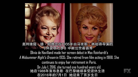 但是,明明剧中就涉及的奥利维拉·德哈维兰就有自己的撕逼史啊!在一起通电中,贝蒂·戴维斯明确的有一句台词:你那个琼可没我这个难搞!奥利维亚·德哈维兰和妹妹琼·芳登近百年的恩怨,也是很适合拍成一出狗血大剧的。就算琼·芳登在前几年去世了,百岁之时接受采访的奥利维亚·德哈维兰还是称她为龙夫人,就是英语俚语中蛇蝎女子的意思。