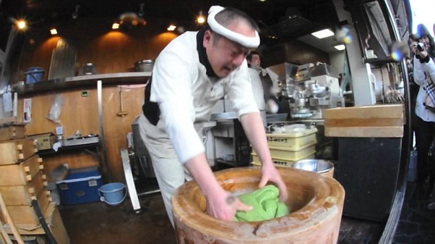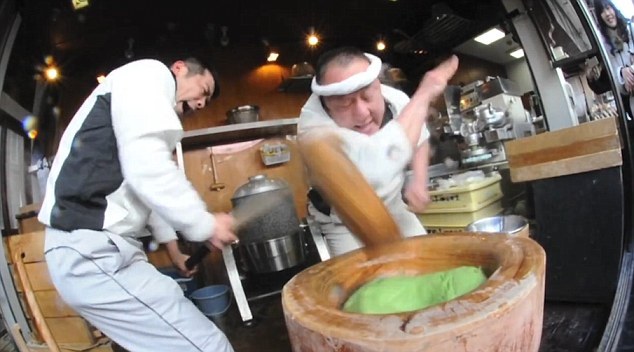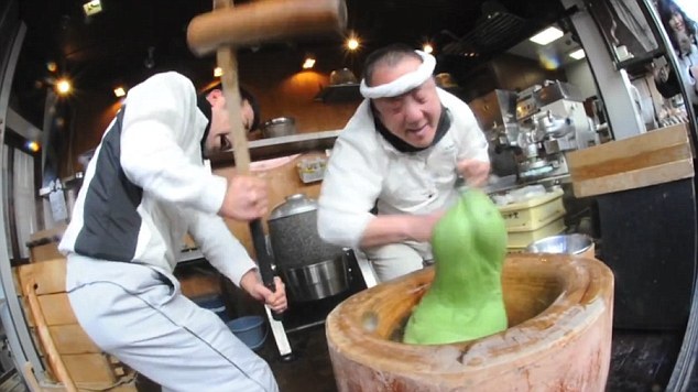 年糕是用糯米面团经过击打捣碎、蒸熟而制成。每天都有数百名粉丝聚集在美都雄的厨房围观,品尝糯米年糕。