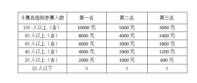 2. 斗舞项目各组别第1名颁发奖杯、奖牌和证书;第2名、第3名颁发奖牌和证书;4-8名颁发奖牌、名次证书;其余选手颁发证书。斗舞项目奖金、奖品设置:成年组斗舞项目前3名按下表方式颁发相应金额的奖金,少儿组和青少年组斗舞项目前3名颁发相应价值的奖品。